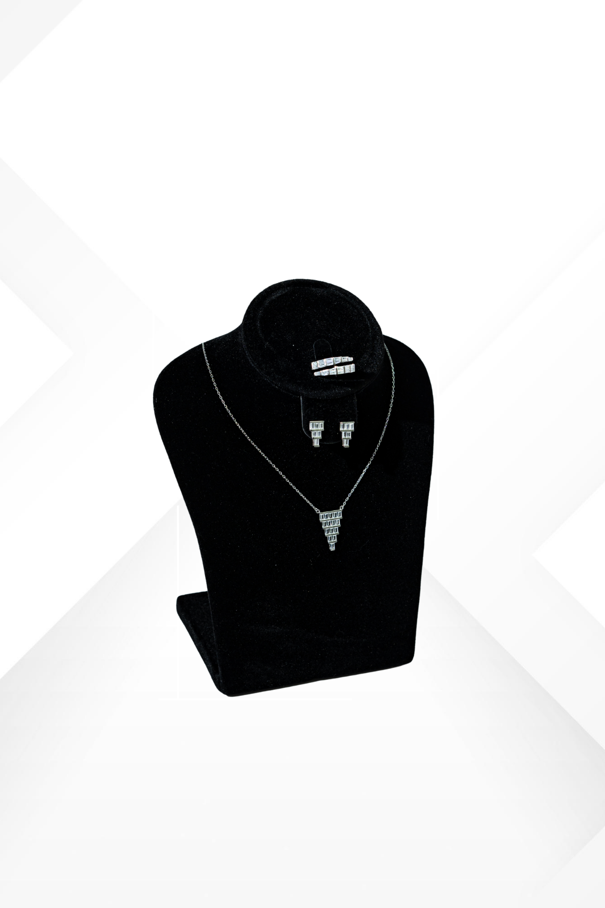 يضم الطقم قلادة بتصميم شلال هندسي يبرز جمال العنق، أقراطاً متدلية تعكس نفس الزخرفة المعمارية، وخاتماً مميزاً يكمل إطلالتكِ بلمسة من الجرأة.