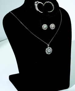 The centerpiece of this collection is the sparkling Zirconium stones, arranged in a sophisticated clustered round design that mimics the brilliance of diamonds. The set includes a delicate necklace with a 4.0mm pendant, matching earrings (3.0mm each), and a stunning ring (3.0mm stone), creating a cohesive and polished appearance.