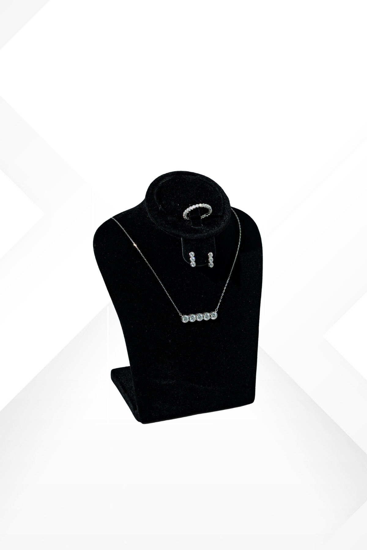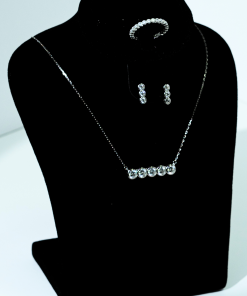 The set includes a chic necklace with five graduated zirconium stones (5.0mm) that offer a subtle yet captivating sparkle. The matching drop earrings feature a two-stone vertical design (3.0mm) that elongates the neck, while the ring showcases a delicate band studded with 1.75mm stones, perfect for wearing solo or stacking.