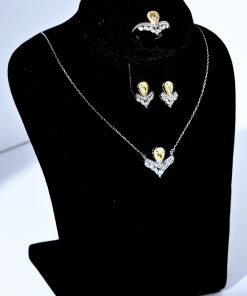 The Mirella Camel Jewelry Set is a luxurious 3-piece collection crafted from 925 Sterling Silver. It features warm Yellow Pear-Cut zirconium stones framed by white crystals in a V-shaped setting.