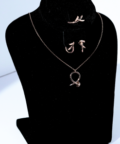 The Zahara Tan Jewelry Set is a graceful 3-piece collection crafted from 925 Sterling Silver. It features a continuous loop knot design encrusted with zirconium, symbolizing eternity.